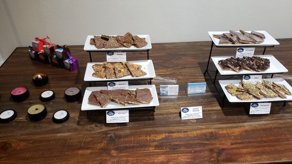 Small gift boxes, holding three pieces of toffee, are available in a dozen colors, and adorned with decorative ribbons.